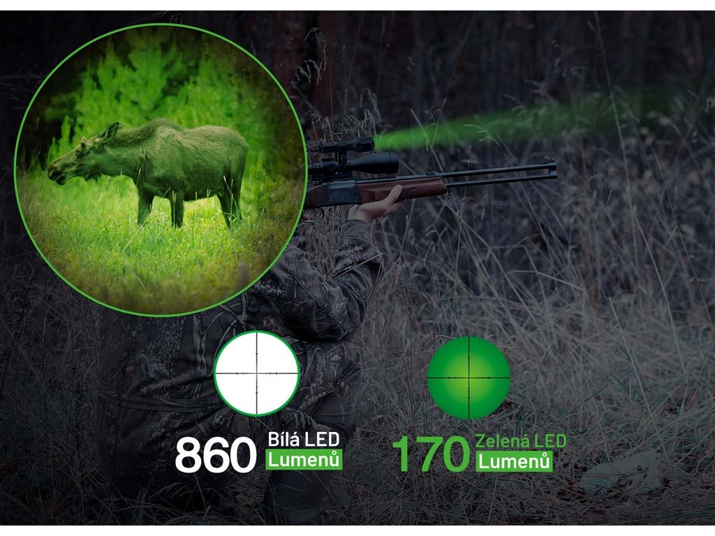 svítivost: až 1200 lm (bílá), až 170 lm (zelená)