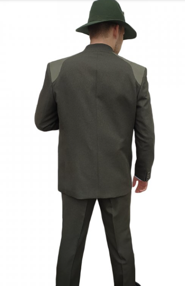 Exklusivní společenský myslivecký oblek zdobený na klopách, ramenou a stojáčku imitací kůže ze zeleného veluru a parohovými knoflíky. Velurem jsou také lemované kapsy. Klopy jsou zdobené dubovými lístky z parohoviny.