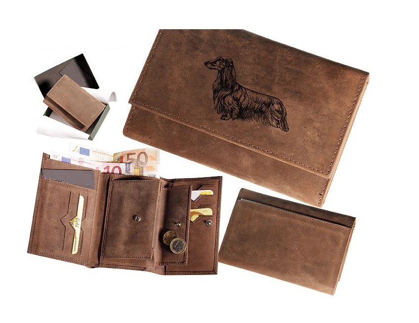 Dámská, středně velká kožená peněženka se zapínáním na magnetický patent s motivem dlouhosrstého jezevčíka.