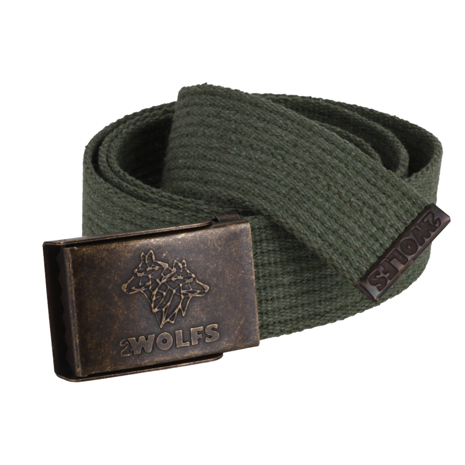 Hlavním funkčním prvkem opasku je kvalitní kovová spona s gravírovaným logem 2WOLFS, která představuje dvě stylizované vlčí hlavy.