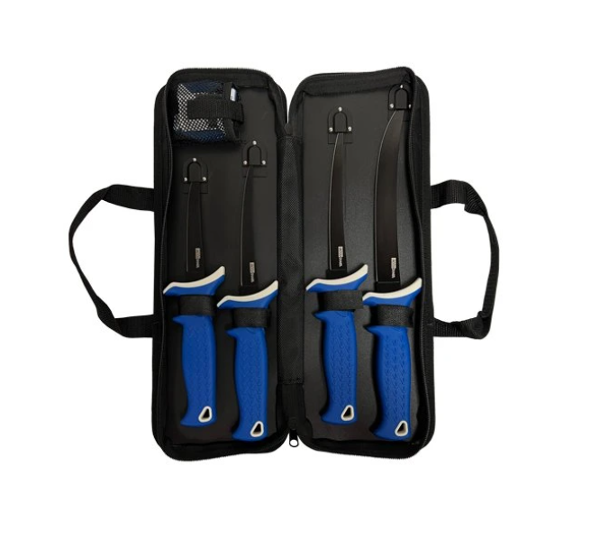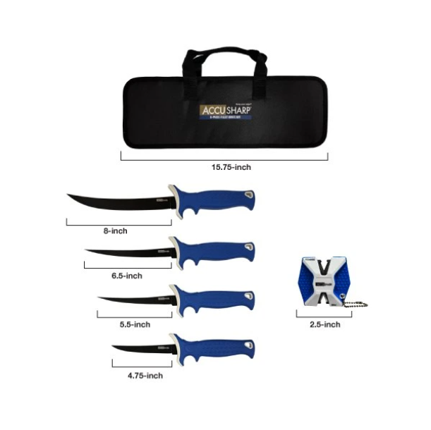 6dílná sada obsahuje - filetovací nůž o délce 8" - filetovací nůž o délce 6,5" - filetovací nůž o délce 5,5" - filetovací nůž o délce 4,75" Čepele jsou vyrobeny z nerezové oceli s matnou povrchovou úpravou a následně potaženy titanem pro posílení ostří proti předčasnému opotřebení. Nože jsou ostré a flexibilní, takže snadno kopírují přirozené kontury ryby a krájejí perfektní filety. Protiskluzové rukojeti s motivem rybích šupin mají lisovaný povrch TPR pro bezpečný a pohodlný úchop při manipulaci s noži. Sada je dodávána s nylonovým přepravním pouzdrem a dvoustupňovým brouskem na nože AccuSharp® Carbide-Ceramic s před zkosenými diamantově broušenými čepelemi z karbidu wolframu, které vám pomohou udržet si ostrost. Hlavní přednosti: - Protiskluzová rukojeť - Čepel s titanovým povlakem a saténovou úpravou - Lehký - Dvoustupňový ostřič s předem zkosenými čepelemi - Čepele z karbidu wolframu - Otvor pro šňůrku - Nylonové pouzdro na přenášení