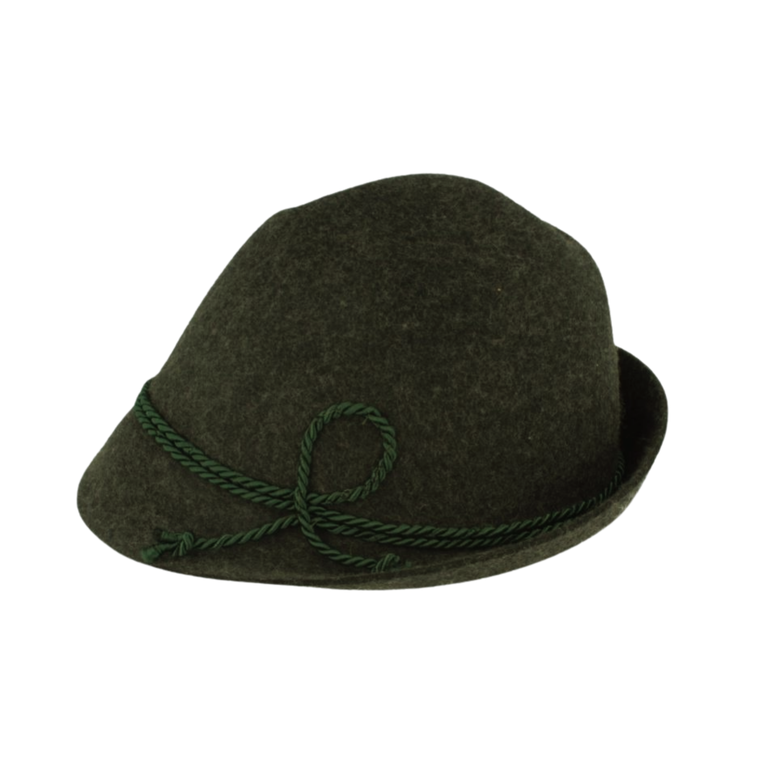 Klobouk Kuba je z vlněné plsti v tradiční barvě zelená melange a je zdoben dvěma kroucenými šňůrkami v barvě klobouku.