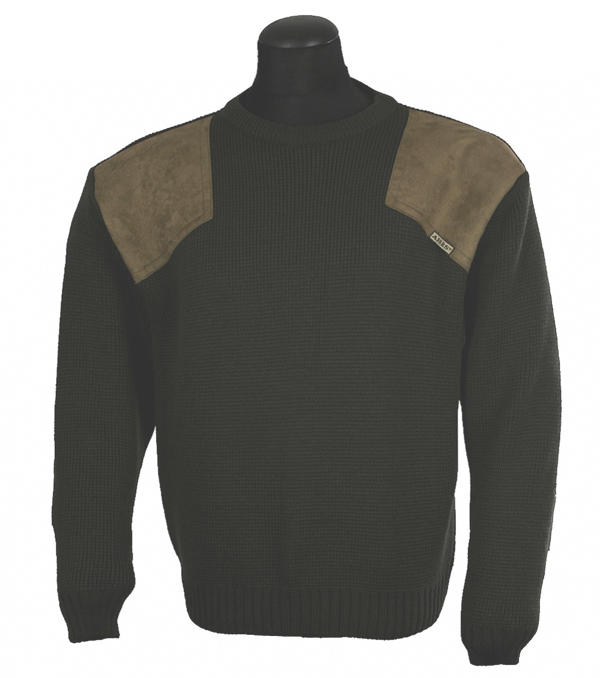 Silnější lovecký svetr ke krku. Na ramenou a loktech jsou našité aplikace z imitace kůže zelené barvy.