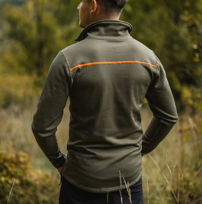 Oranžový štěp na zádech a ramenou dodává oděvu moderní vzhled a zároveň slouží i jako důležitý bezpečnostní prvek, který zvyšuje viditelnost v přírodě, například při společných honech, nebo v hustém porostu.