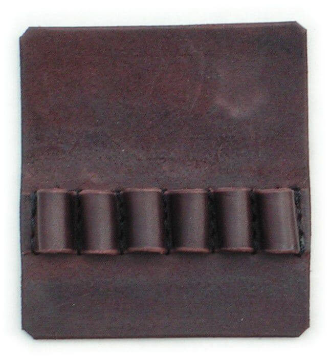 Kožená destička na 4 - 6 nábojů. Je vhodná do kapsy, aby vám náboje v kapse necinkaly. Vzhledem k tomu, že je kůže pružná, přizpůsobí se poutka na náboje všem běžným zážím. Není tedy třeba požadovat destičky na konkrétní ráže.